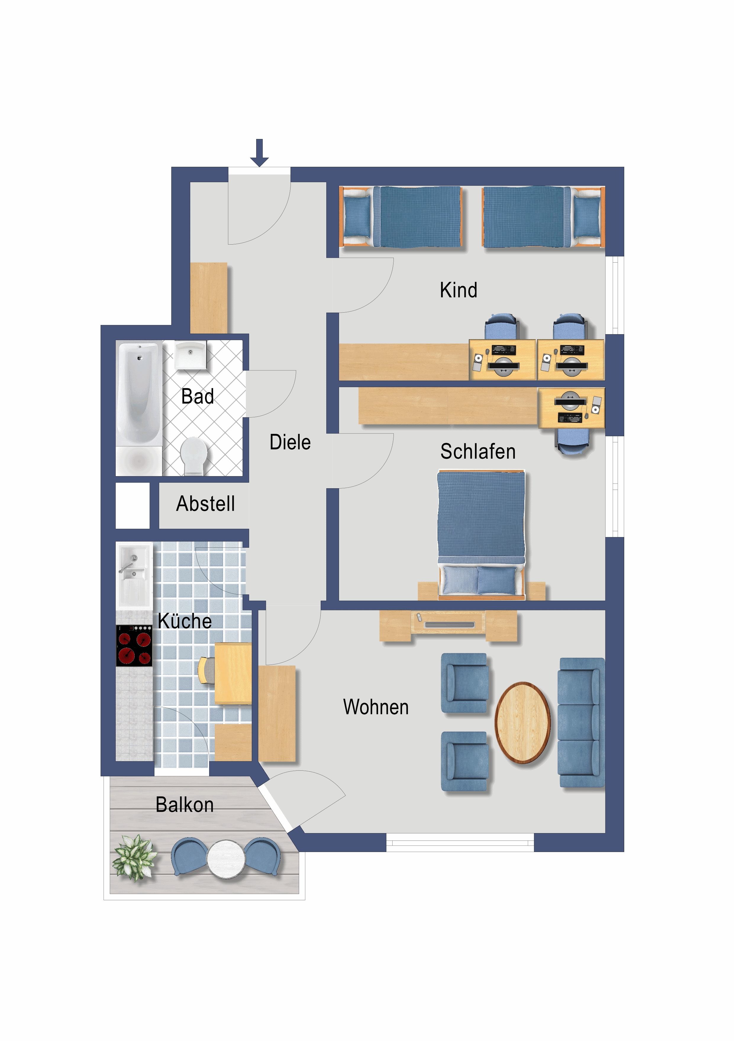 Die Wohnung besteht insgesamt aus drei Zimmern, die ausreichend Platz bieten. Das helle Wohnzimmer lädt zum Entspannen und Verweilen ein, die beiden weiteren Zimmer können als Schlafzimmer, Arbeitszimmer oder Gästezimmer genutzt werden. Die separate, moderne Einbauküche ist mit hochwertigen Geräten ausgestattet und der Küchenraum bietet Platz für eine gemütliche Essecke. Das Badezimmer verfügt über eine Badewanne mit Duschabtrennung, Waschbecken, WC und Waschmaschinenanschluss.